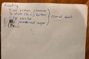 Cake2 eggs3/4 cup sugar2/3 cup oil1 cup flour1 t baking soda1 t baking powder1 t cinnamon1/2 tsp. salt1/2 cup grated carrots1/2 cup crushed pineapple1/2 cup nutsFrosting11 oz. cream cheese1/2 stick (1/4 c.) butter1 t vanilla1 3/4 cup powdered sugar